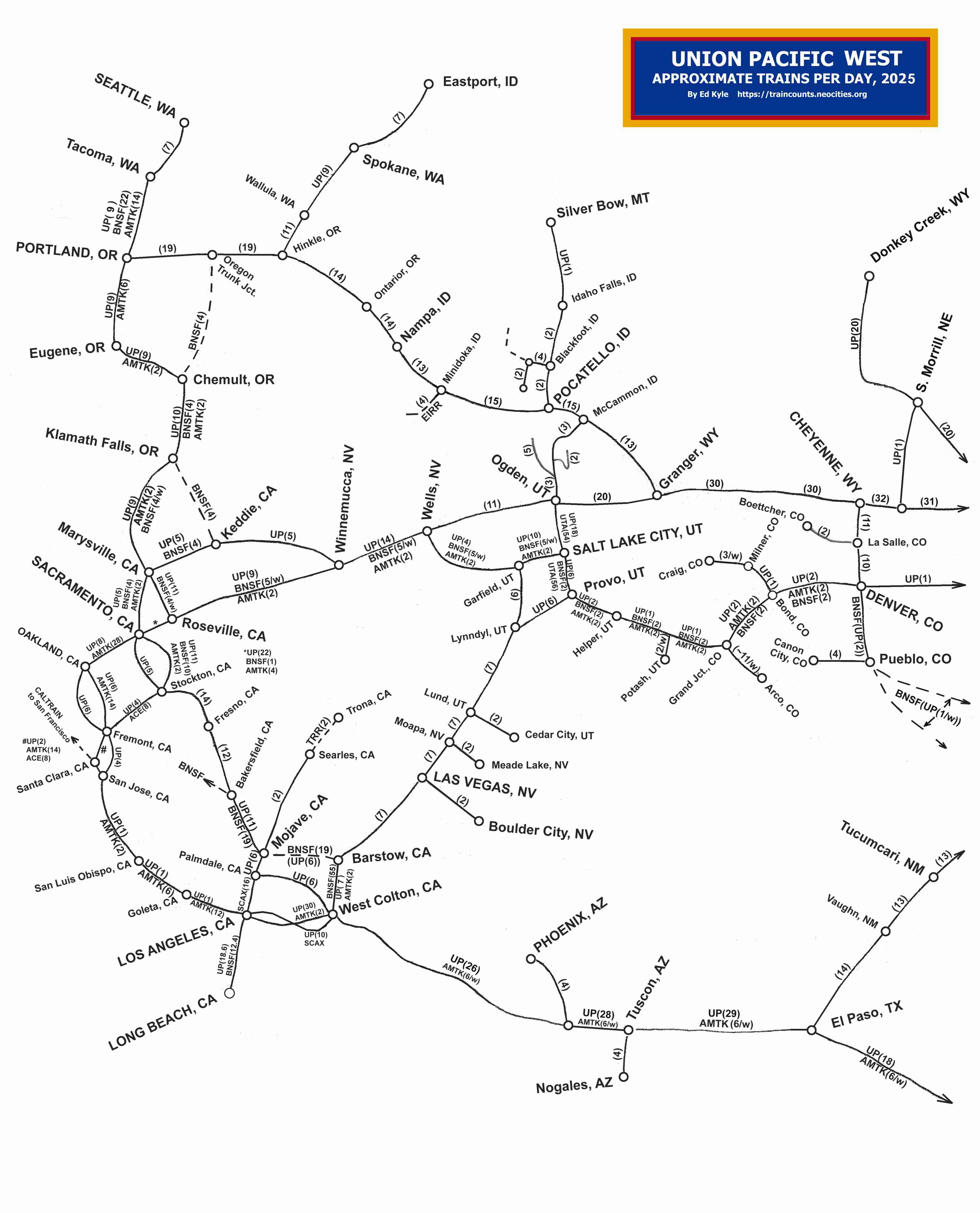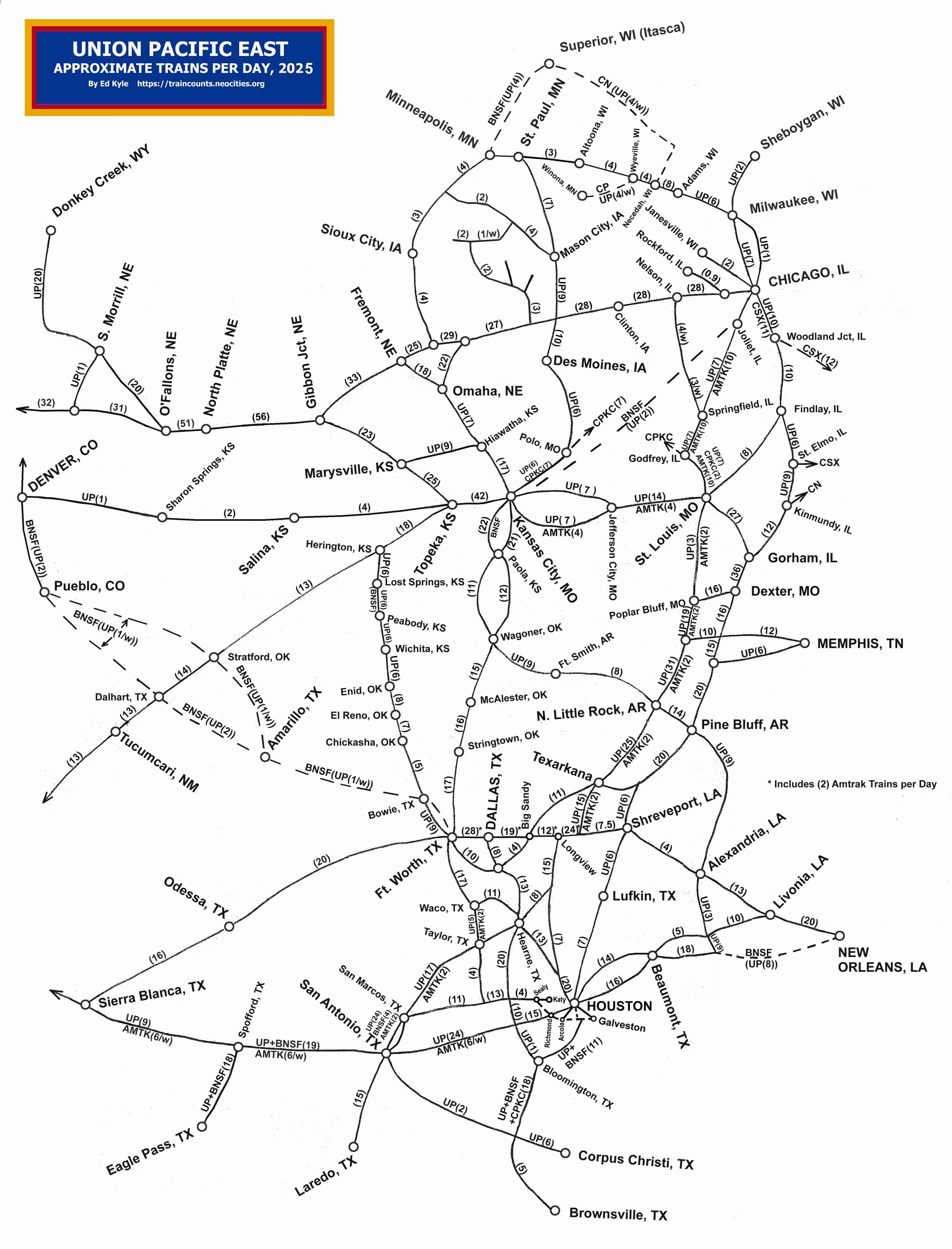 trains/day on North American railroads, based on FRA, trade, and hobby